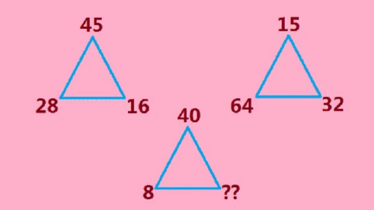 Trong hình ảnh, hai tam giác phía trên có đầy đủ các con số ở ba đỉnh, còn tam giác phía dưới lại để trống một giá trị với dấu “??”. Nhiệm vụ của người chơi là quan sát mối liên hệ giữa các con số trong từng tam giác để suy ra quy luật chung.