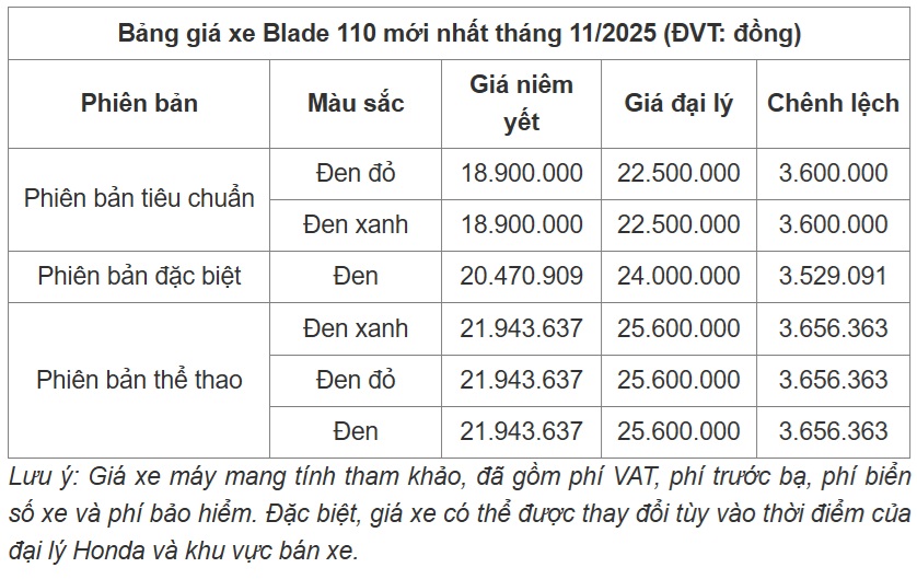 Theo ghi nhận, giá niêm yết xe Honda Blade 110 trong tháng 11/2025 vẫn được giữ nguyên ở mức cũ của tháng trước, cụ thể: Phiên bản tiêu chuẩn đang có giá bán 18.900.000 đồng, phiên bản đặc biệt đang có giá bán 20.470.909 đồng và phiên bản thể thao đang có giá bán 21.943.637 đồng.