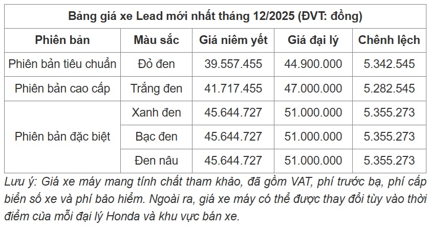 Theo ghi nhận, giá niêm yết của xe Honda Lead trong tháng 12 này không có sự thay đổi nào so với tháng 11/2025, cụ thể: Bản tiêu chuẩn vẫn có mức giá bán 39.557.455 đồng, bản cao cấp vẫn có mức giá bán 41.717.455 đồng và bản đặc biệt vẫn có mức giá bán 45.644.727 đồng.