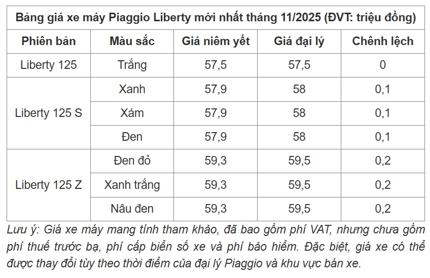 Theo ghi nhận, xe tay ga Liberty trong tháng 11/2025 vẫn được hãng Piaggio bán ra thị trường 3 phiên bản: Liberty 125, Liberty 125 Z và Liberty 125 S. Đi cùng 7 tùy chọn màu sắc như: Đen đỏ, nâu đen, trắng, xanh, xám, đen và xanh trắng.