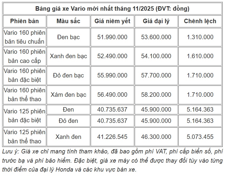 Theo ghi nhận, xe tay ga Vario của Honda trong tháng 11/2025 vẫn bán ra thị trường với 2 mẫu xe: Vario 125 và Vario 160, đi kèm với nhiều phiên bản và tùy chọn màu sắc khác nhau.