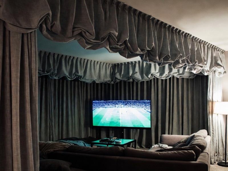 Trong kỹ thuật nội thất, vải dệt là vật liệu tiêu âm cực tốt. Việc sử dụng rèm vải dày, dệt nhiều lớp chính là giải pháp đơn giản nhưng hiệu quả để xử lý âm thanh trong phòng xem bóng đá.