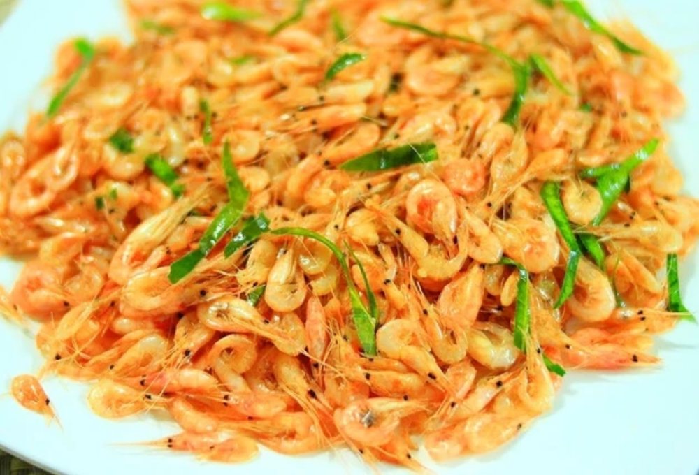 Bắc chảo lên bếp, cho một chút dầu ăn. Khi dầu nóng, phi hành tím và tỏi thơm vàng. Cho tép vào, đảo đều trên lửa lớn để tép săn lại và bốc hơi nước nhanh.