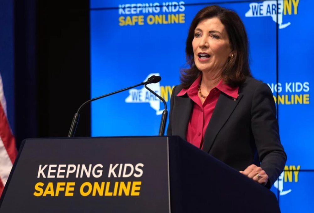 Thống đốc New York Kathy Hochul phát biểu tại sự kiện công bố luật mới yêu cầu các nền tảng mạng xã hội hiển thị cảnh báo về nguy cơ ảnh hưởng đến sức khỏe tâm thần của trẻ em. (Nguồn: Associated Press)