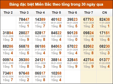 Thống kê giải đặc biệt theo tổng trong vòng 30 ngày tính đến 06/02/2026