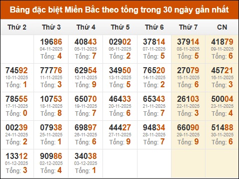 Thống kê GĐB XSMB theo tổng trong 30 ngày gần đây tính đến 04/12/2025