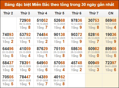 Thống kê giải đặc biệt theo tổng trong vòng 30 ngày tính đến 09/01/2026