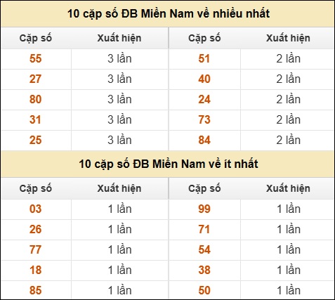 ⚡ 10 cặp số ĐB Miền Nam về nhiều nhất/ ít nhất tính đến ngày 01/02/2026: