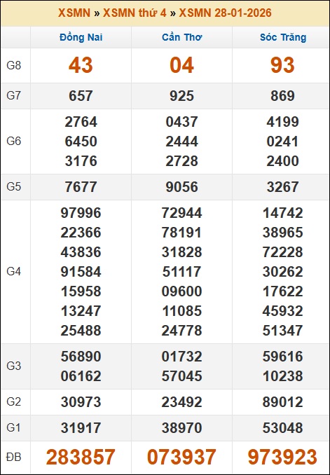 Kết quả xổ số Miền Nam ngày 28/01/2026 thứ 4 tuần trước