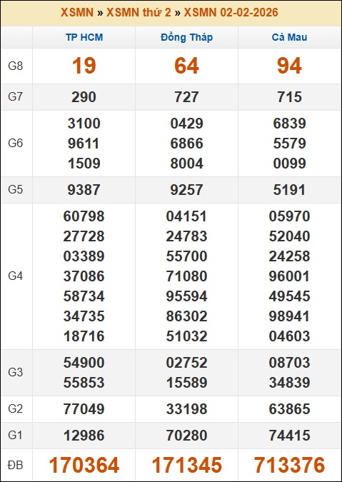 Kết quả xổ số Miền Nam 02/02/2026 thứ 2 tuần trước