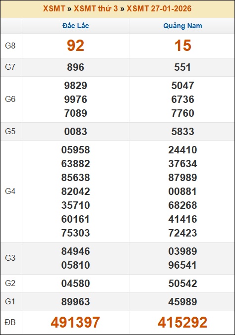 Kết quả xổ số Miền Trung 27/01/2026 thứ 3 tuần trước