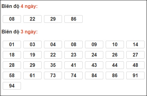 Đuôi 1: 23 ngày, Đuôi 3: 9 ngày, Đuôi 4: 6 ngày, Đuôi 6: 4 ngày, Đuôi 8: 4 ngày
