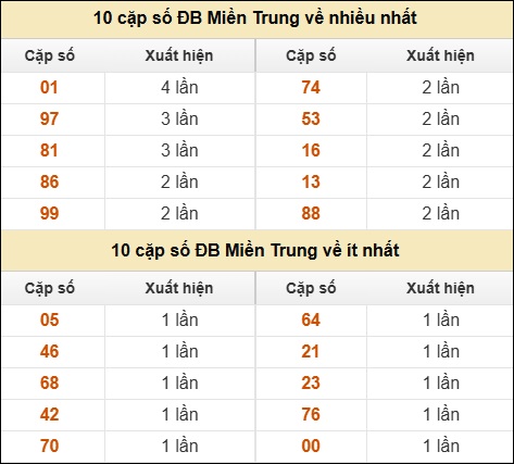 ⚡ 10 cặp số ĐB XSMT về nhiều nhất/ ít nhất tính dến ngày 10/01/2026: