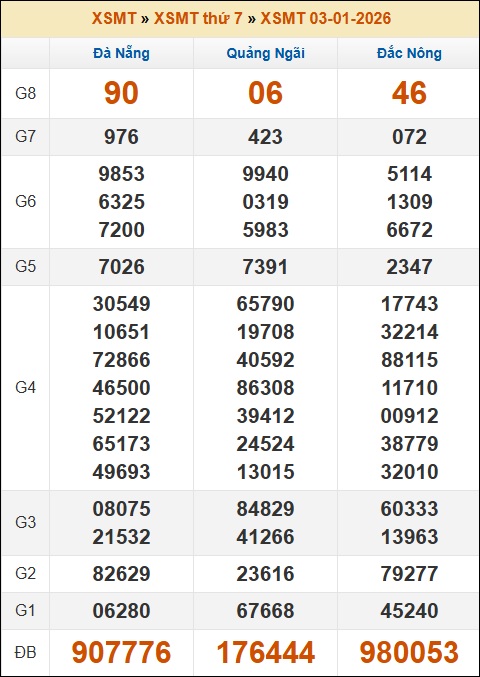 Kết quả xổ số Miền Trung 03/01/2026 thứ 7 tuần trước