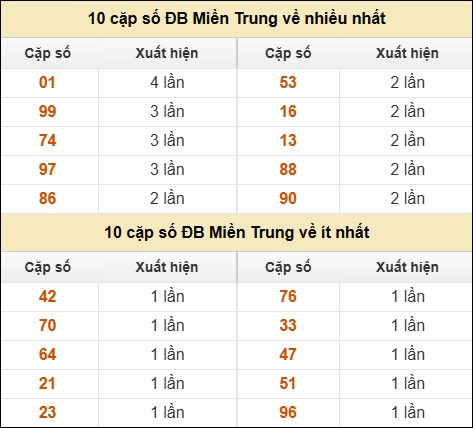 ⚡ 10 cặp số ĐB XSMT về nhiều nhất/ ít nhất tính dến ngày 31/01/2026: