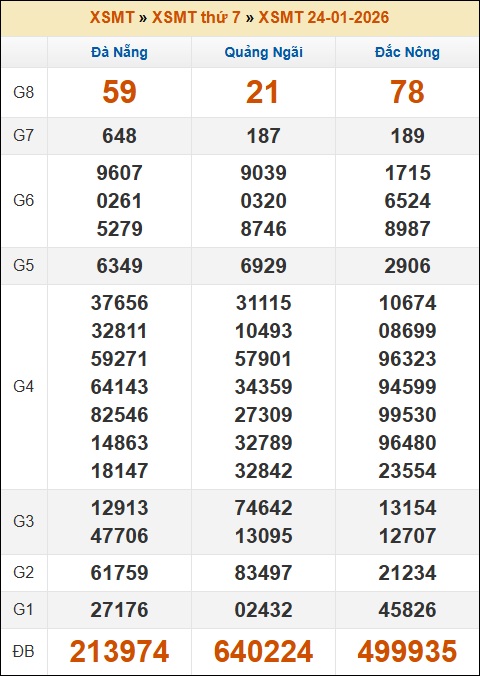 Kết quả xổ số Miền Trung 24/01/2026 thứ 7 tuần trước