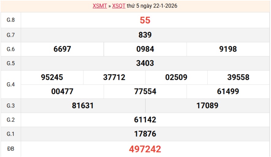 Mời các bạn xem lại bảng kết quả kỳ trước với giải đặc biệt, giải tám, lô tô 2 số để có thể đưa ra nhận định dự đoán QT ngày 29/01/2026 chuẩn xác nhất.
