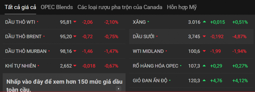 Lúc 6h, giá dầu WTI được giao dịch ở mức khoảng 96,57 USD/thùng, giảm 1,3 USD/thùng so với phiên trước. Trong khi đó, dầu Brent của Mỹ ở mức 95,2 USD/thùng, giảm 0,72 USD/thùng.