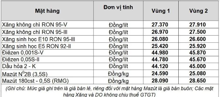 Giá xăng trong nước hiện tiếp tục được phân chia theo hai vùng với mức chênh lệch nhẹ giữa từng khu vực. Cụ thể, xăng không chì RON 95-V tại Vùng 1 đang được niêm yết ở mức 27.370 đồng/lít, trong khi tại Vùng 2 là 27.910 đồng/lít. Xăng RON 95-III lần lượt đạt 26.970 đồng/lít và 27.500 đồng/lít, còn xăng sinh học E5 RON 92-II dao động trong khoảng 25.420 – 25.920 đồng/lít, giữ vị trí thấp nhất trong nhóm xăng.