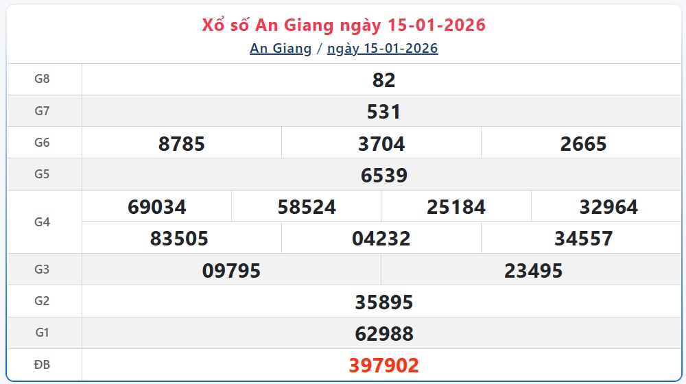 Hãy theo dõi kết quả xổ số An Giang hôm nay 15/1/2026 để cập nhật kết quả sớm nhất.