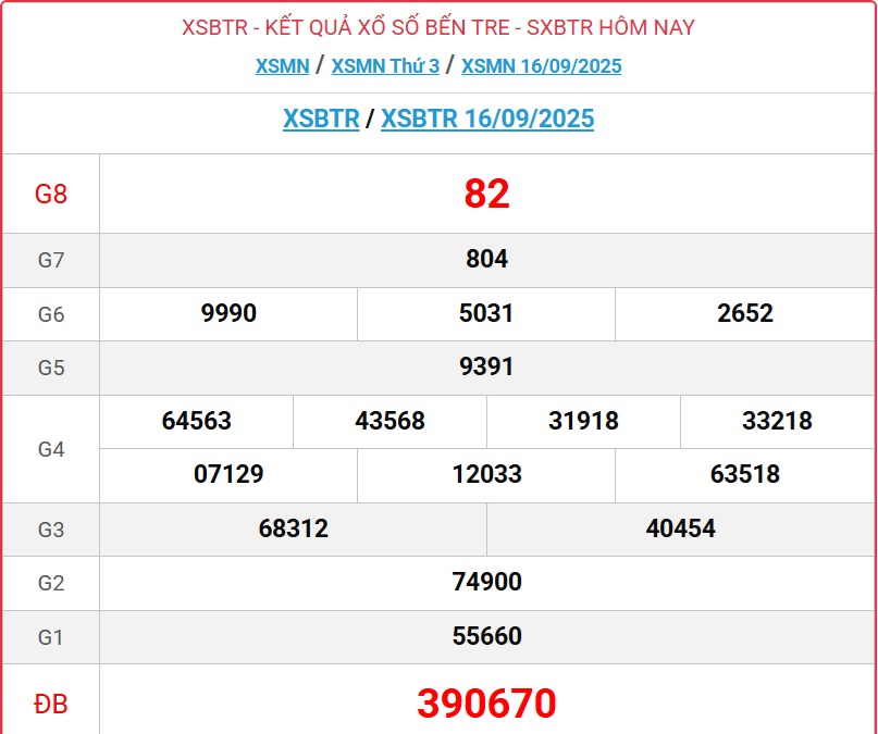 Kết quả xổ số Bến Tre hôm nay 7/10/2025 được quay vào lúc 16 giờ 15 phút vào ngày Thứ Ba hàng tuần, mở thưởng bởi Công ty TNHH MTV Xổ số kiến thiết Bến Tre và bắt đầu từ giải tám cho đến giải nhất, cuối cùng là công bố giải đặc biệt.