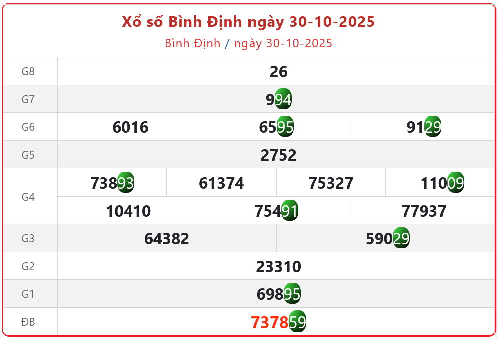 Xem Kết quả xổ số Bình Định ngày 30/10/2025