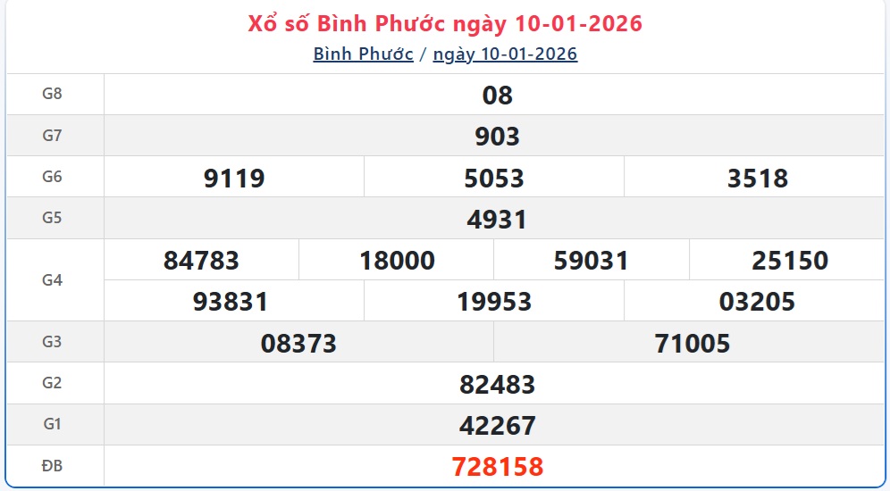 Kết quả xổ số Bình Phước hôm nay ngày 10/1/2026 sẽ được cập nhật nhanh chóng và chính xác nhất. Kết quả các giải thưởng XSBP 10/1/2026 được công bố lần lượt từ giải nhất cho đến giải tám, cuối cùng là giải đặc biệt.