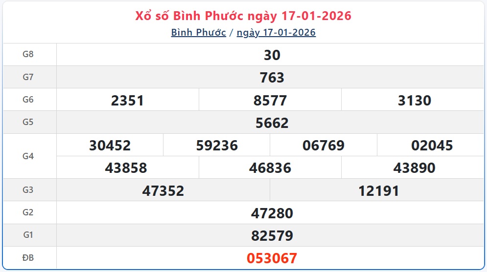 Kết quả xổ số Bình Phước hôm nay ngày 17/1/2026 sẽ được cập nhật nhanh chóng và chính xác nhất. Kết quả các giải thưởng XSBP 17/1/2026 được công bố lần lượt từ giải nhất cho đến giải tám, cuối cùng là giải đặc biệt.