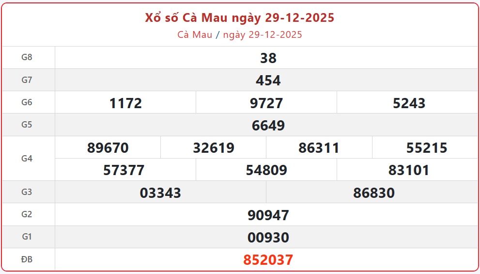 Trực tiếp Kết quả xổ số Cà Mau hôm nay - Kết quả XSCM 29/12 - XSCM hôm nay Thứ Hai ngày 29/12/2025