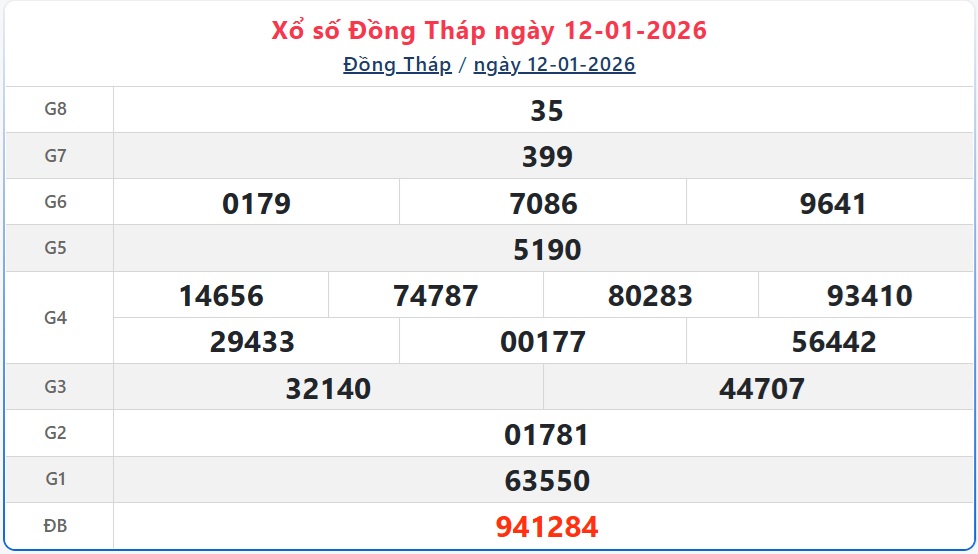 Kết quả xổ số Đồng Tháp hôm nay 12/1/2026 được quay thưởng vào lúc 16h15 bởi Công ty TNHH MTV Xổ số kiến thiết Đồng Tháp. Kết quả các giải thưởng của XSDT 12/1/2026 sẽ được công bố lần lượt từ giải nhất cho đến giải tám, cuối cùng là giải đặc biệt.