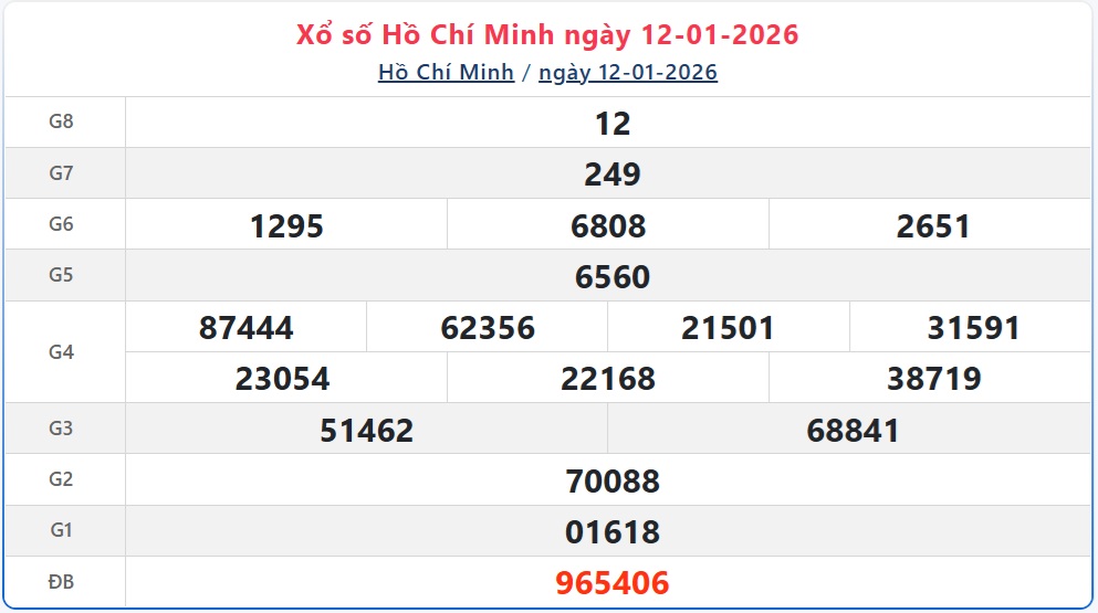 Kết quả xổ số Hồ Chí Minh ngày 12/1/2026