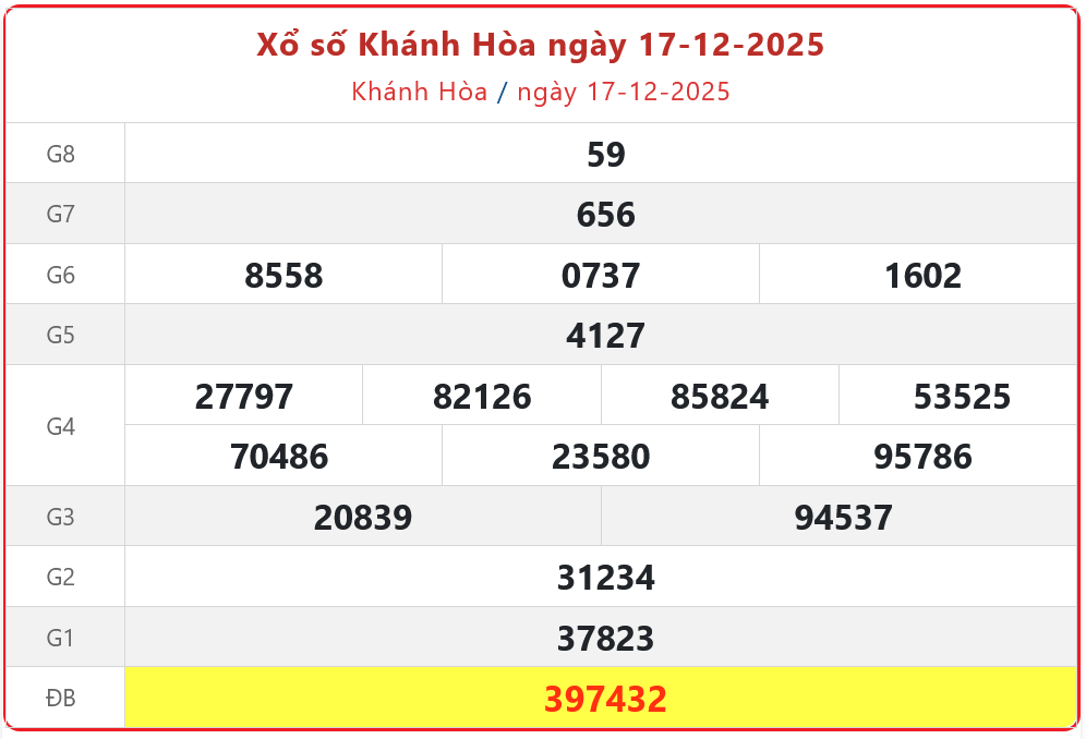 Kết quả xổ số Khánh Hòa ngày 17/12/2025