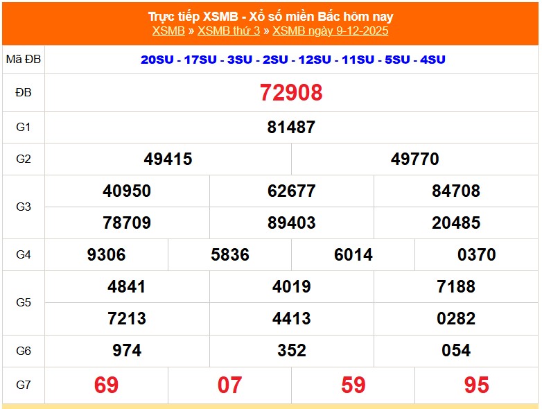 Kết quả Xổ số miền Bắc ngày 9/12/2025