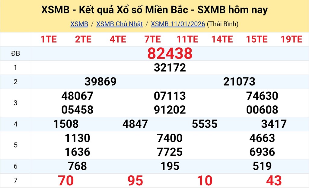 Kết quả xổ số miền Bắc ngày 11/1/2026. KQXSMB 11/1