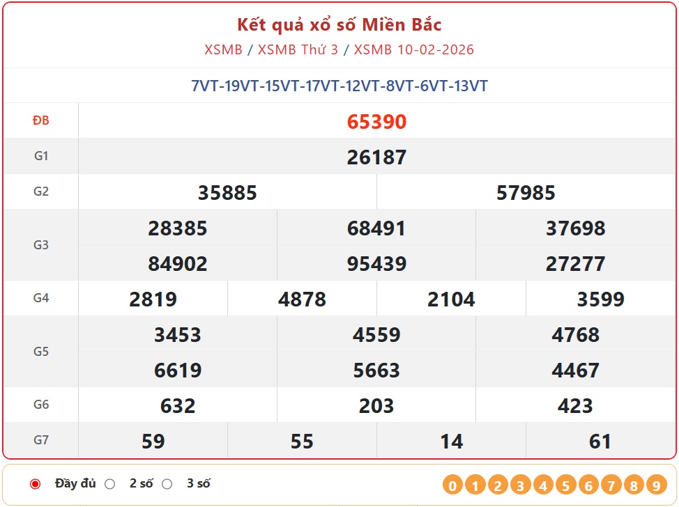 Kết quả Xổ số miền Bắc ngày 10/2/2026