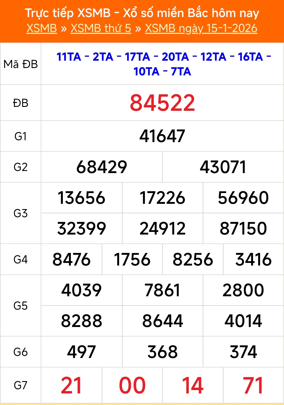 Kết quả xổ số miền Bắc ngày 15/1/2026. KQXSMB 15/1