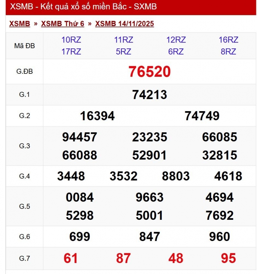 Kết quả xổ số miền Bắc ngày 16/11/2025. KQXSMB 16/11