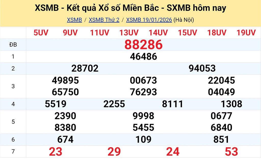 Kết quả Xổ số miền Bắc ngày 19/1/2026