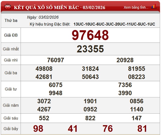 Kết quả Xổ số miền Bắc ngày 3/2/2026