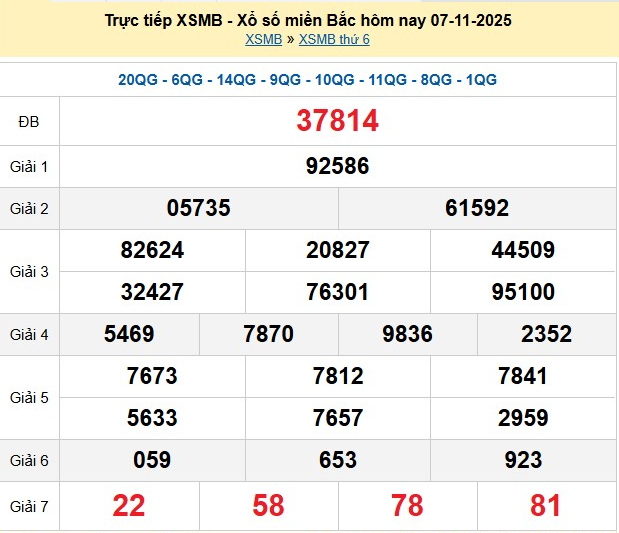 Kết quả Xổ số miền Bắc ngày 7/11/2025