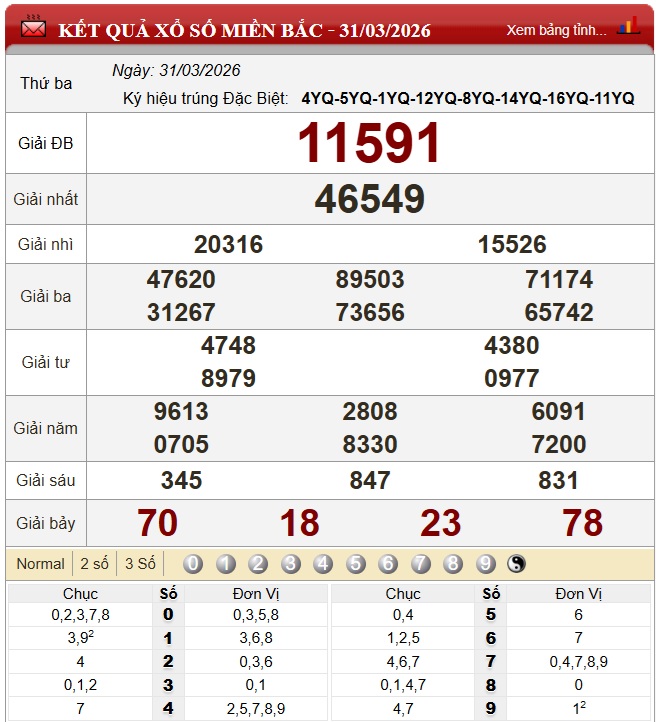 Kết quả Xổ số miền Bắc ngày 31/3/2026