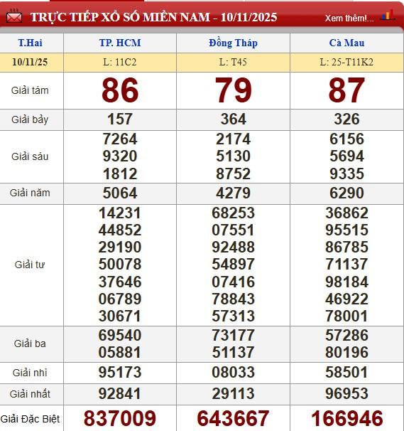Kết quả xổ số miền Nam ngày 10/11/2025. KQXSMN 10/11