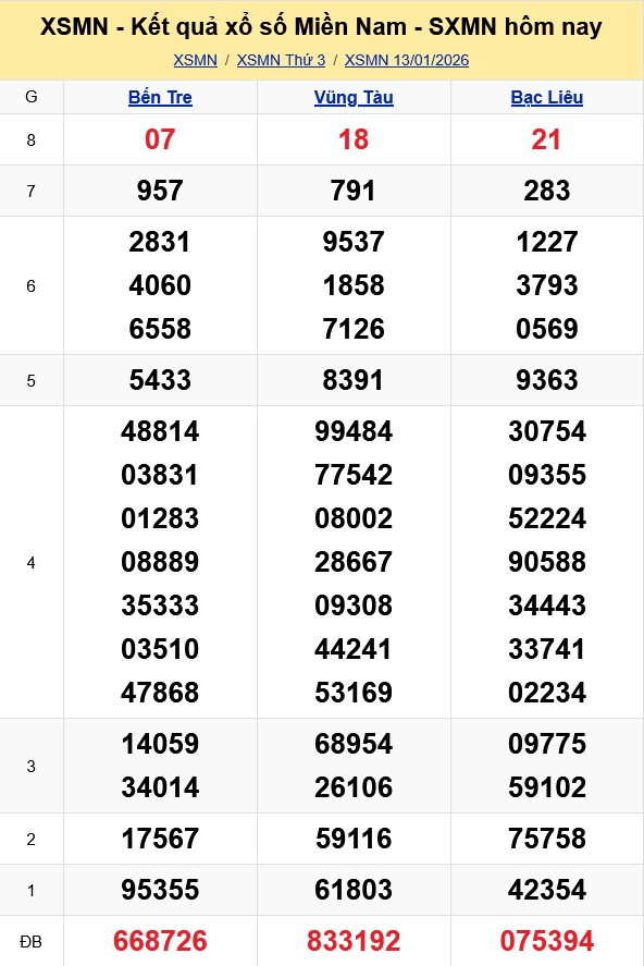 Kết quả xổ số miền Nam ngày 13/1/2026