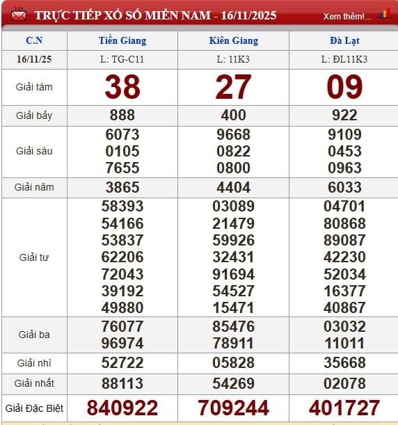 Kết quả xổ số miền Nam (XSMN) được thực hiện lúc 16 giờ 30 phút và được mở thưởng bởi Công ty xổ số kiến thiết của Tiền Giang (XSTG), Đà Lạt (XSĐL), Kiên Giang (XSKG). Kết quả của đài nào sẽ được mở thưởng tại trường quay của tỉnh đó. Xổ số hôm nay - KQXSMN ngày 16/11 được quay thưởng bắt đầu từ giải tám cho đến giải nhất, cuối cùng là công bố kết quả giải đặc biệt.