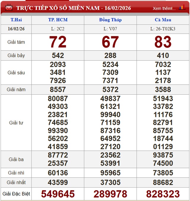 Kết quả xổ số miền Nam ngày 16/2/2026