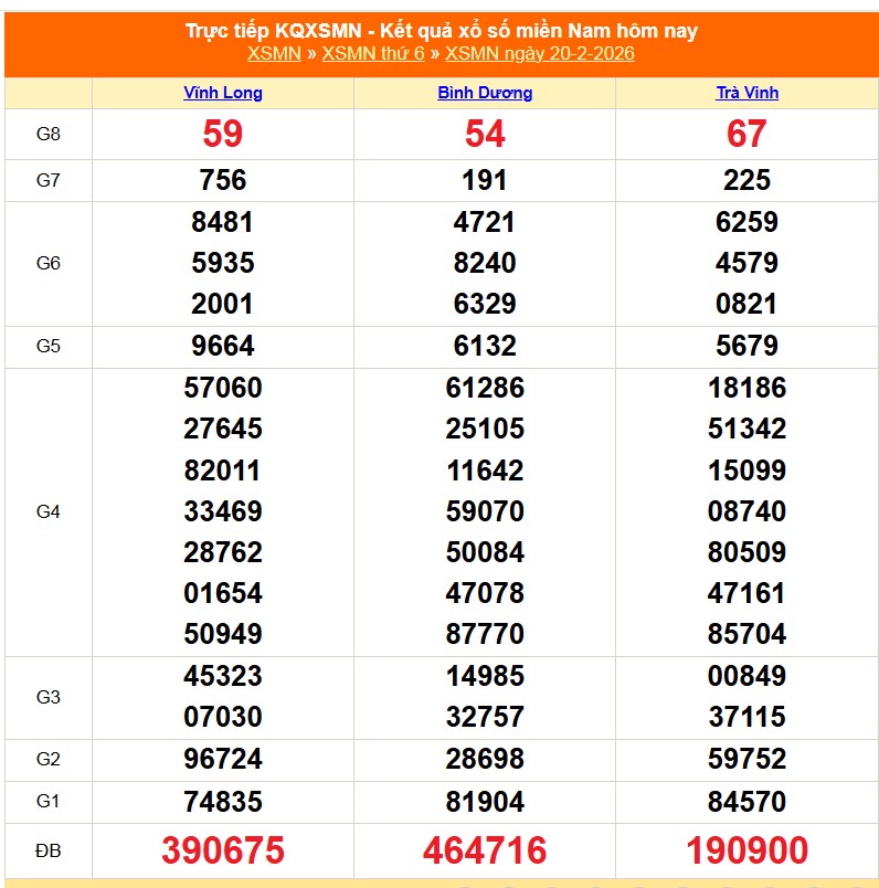 Kết quả xổ số miền Nam ngày 20/2/2026
