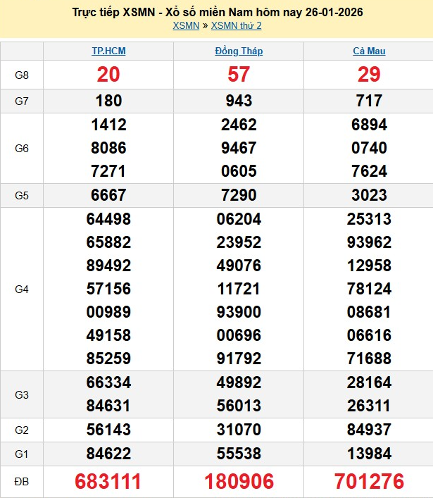Kết quả xổ số miền Nam ngày 26/1/2026