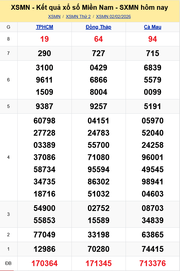 Kết quả xổ số miền Nam ngày 2/2/2026