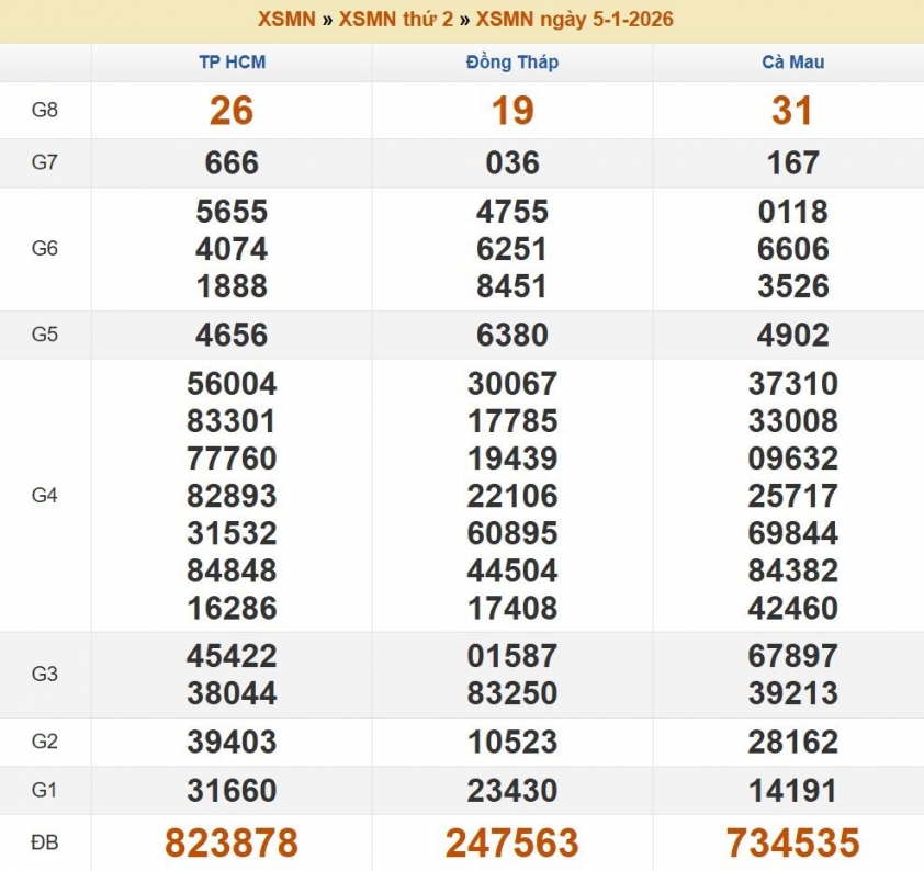 Kết quả xổ số miền Nam ngày 5/1/2026