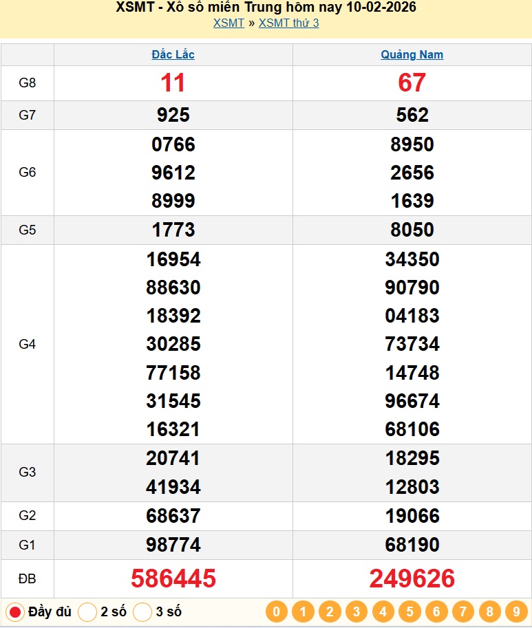 Kết quả xổ số miền Trung ngày 10/2/2026